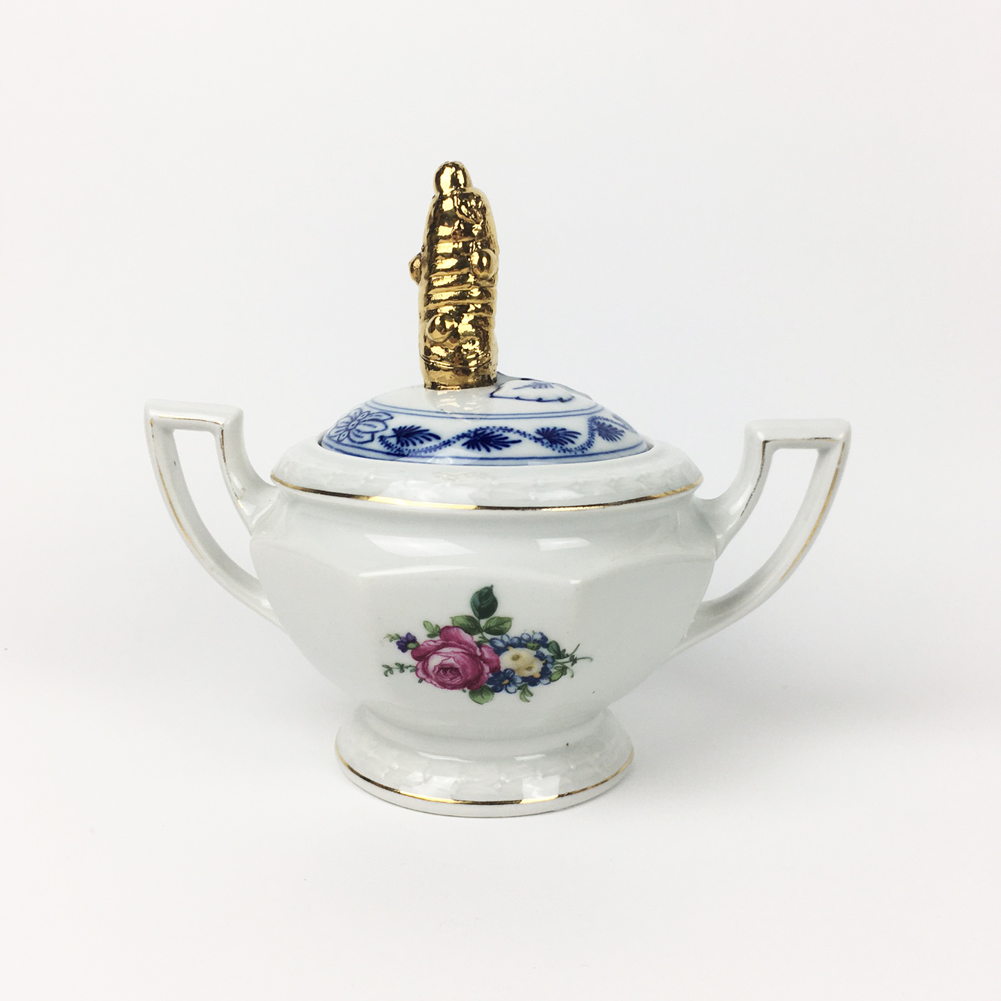 Porcelánová cukřenka s chybějícím víčkem. A cibulákové víčko s uraženým úchytem a chybějícím tělem – dózou či cukřenkou. Skombinovali jsme oba kusy a víčku domodelovali úchytku. Dále pokoveno a pozlaceno.