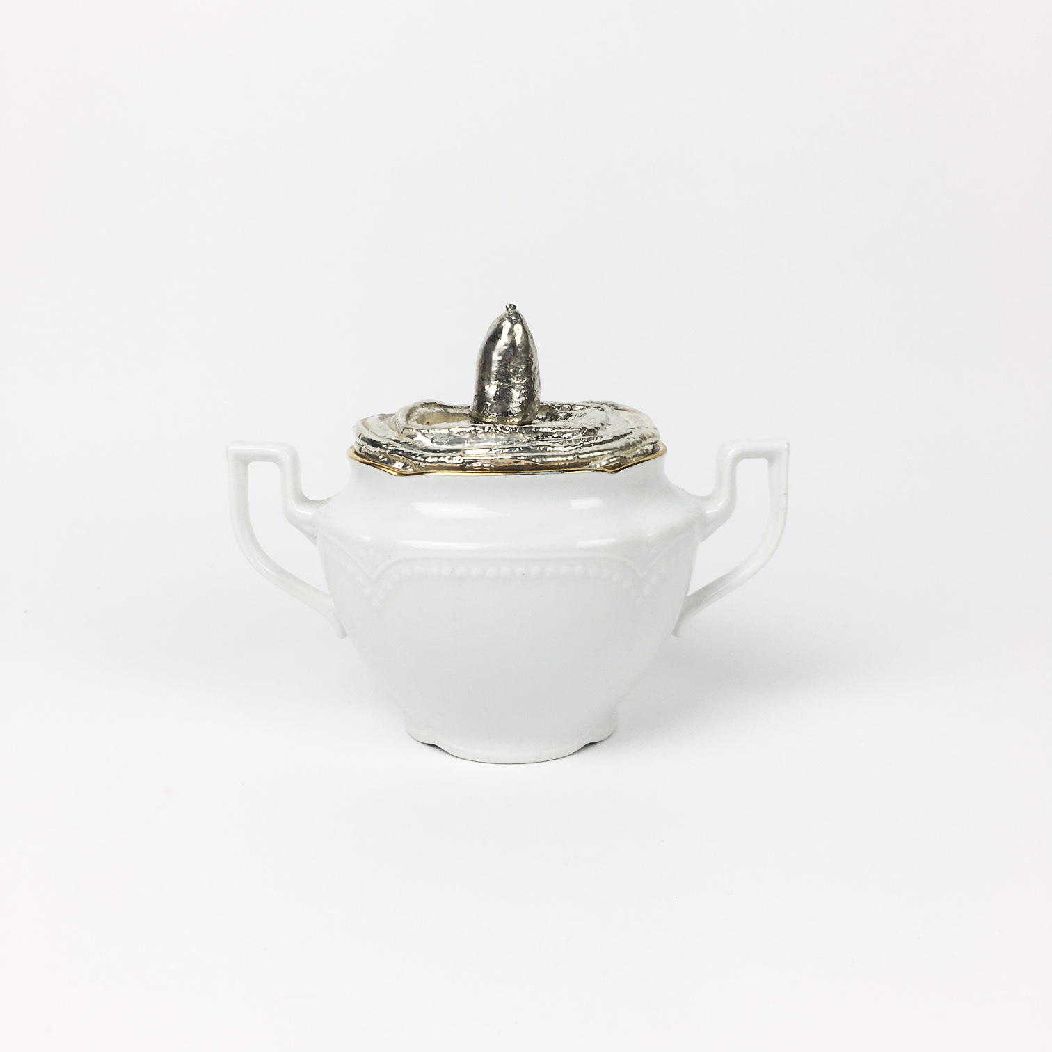 Porcelánová, oválná cukřenka s chybějícím víčkem. Tak jsem jej domodelovali. Dále pokoveno a postříbřeno.