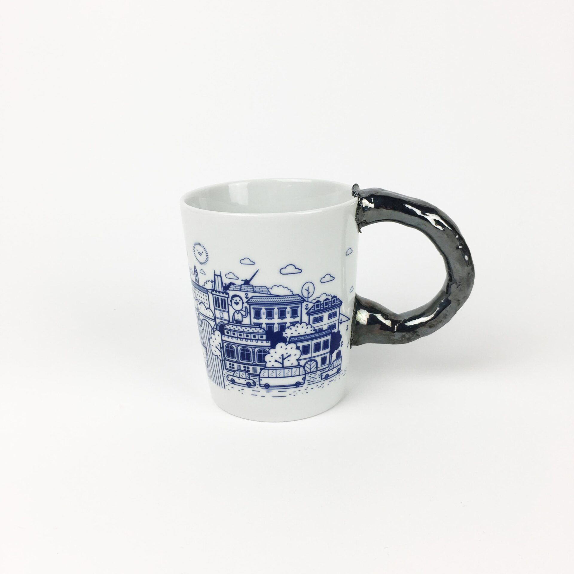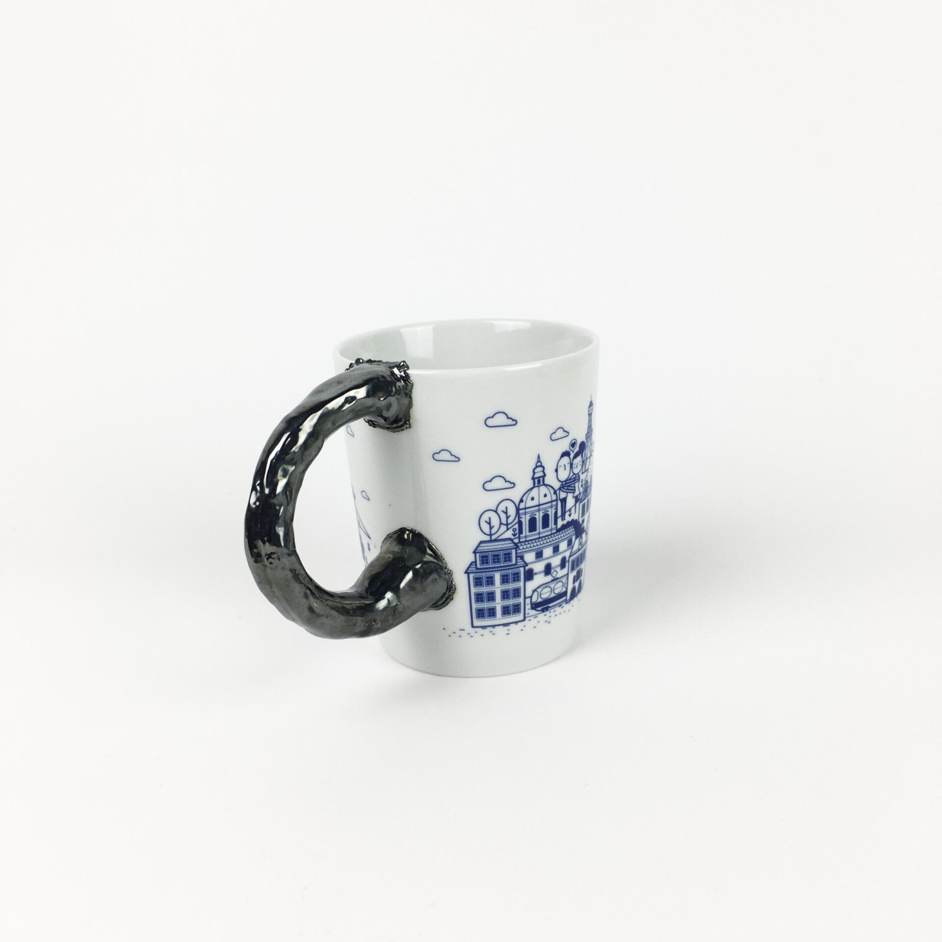 Hrnek z kolekce Pragtique s uraženým uchem. Domodelované ucho, galvano vrstva a pokov.