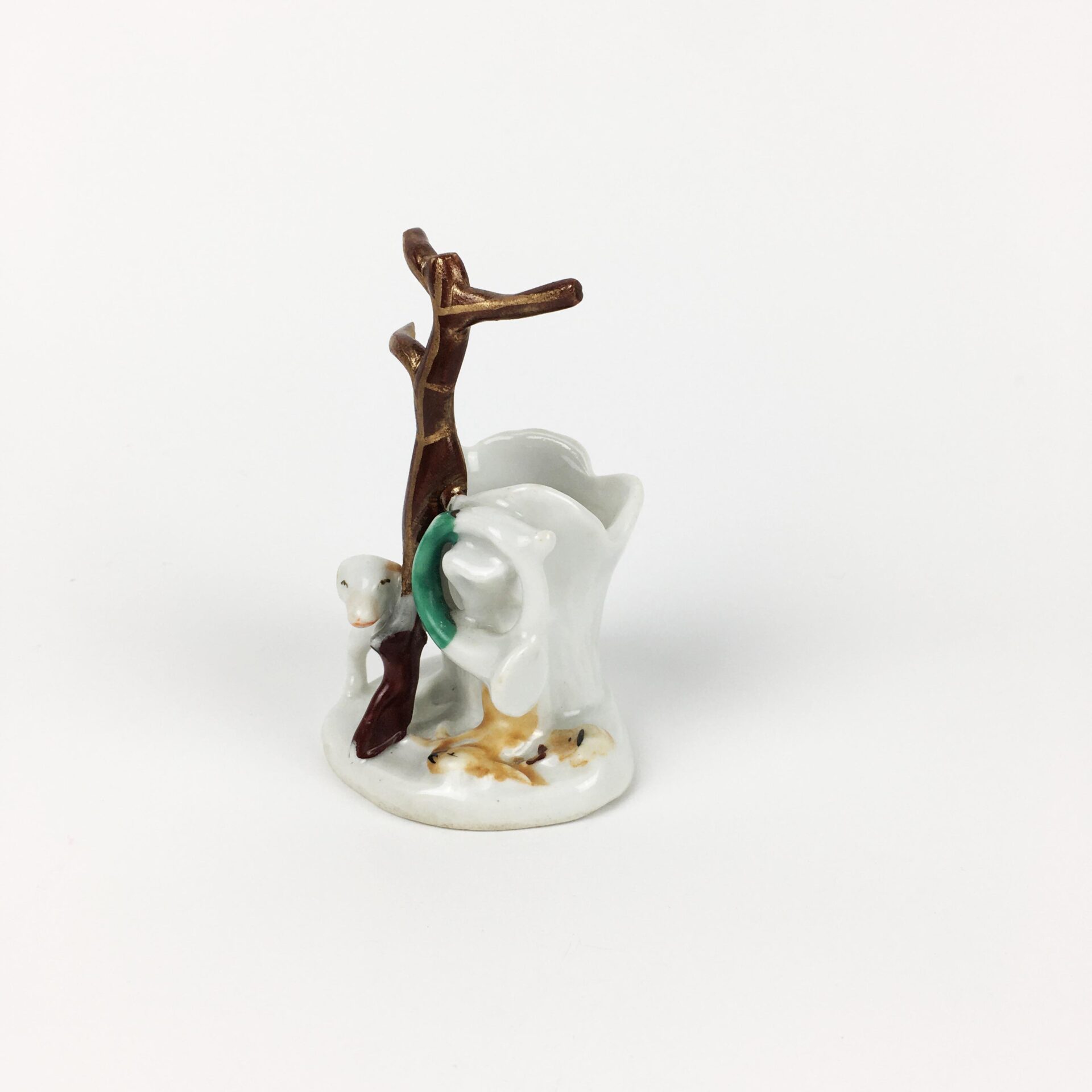 Nalezená dóza či stojánek s rozbitým horník okrajem a chybějícím něčím… Domodelovali jsme větev, která teď slouží coby závěs na šperky, stojánek na dýmku, nebo divný květináč?Uchvátila nás lovecká/myslivecká tématika celého polo-výjevu.