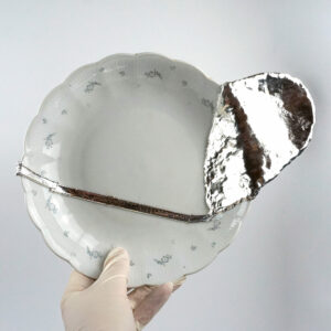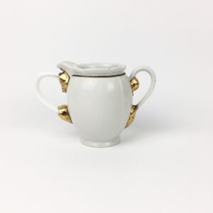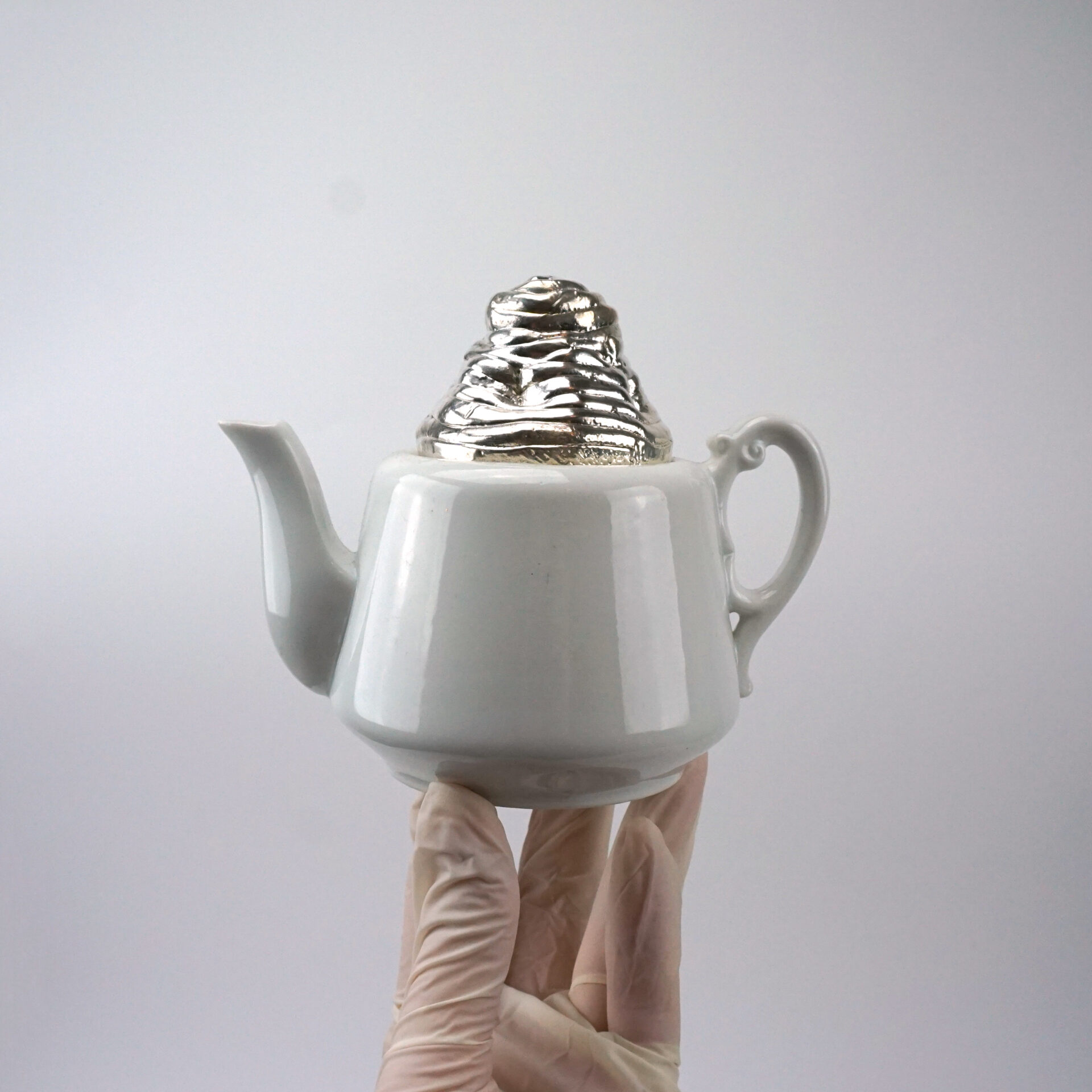 Porcelánová, nalezená konvička s chybějícím víčkem. Domodelováno, naší technikou „šólám hady“, poté aplikace galvano a nakonec povrchově upraveno stříbrem. Víčko sdí a má i zámek, aby při používání neklouzalo, nepadalo.